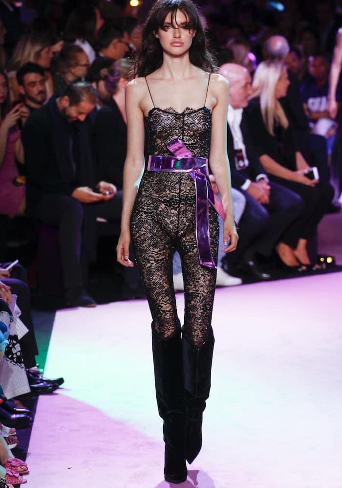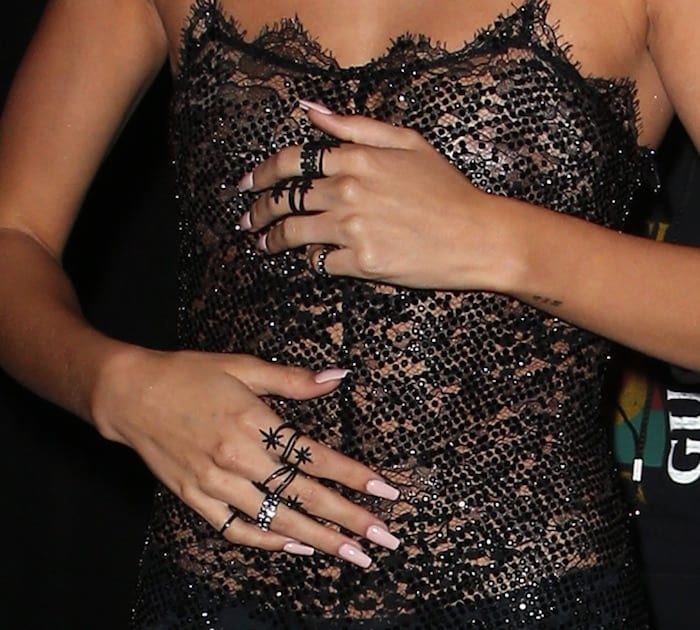 Later that night, Hailey switched to another designer jumpsuit – this time a black couture creation from Alexandre Vauthier’s Autumn Winter 2017 collection. The barely-there outfit still showed off lots of skin and featured embellishments from head-to-toe. Of course, the blonde beauty put on a different pair of shoes – suede boots from the same designer. She changed her accessories as well and donned hoop earrings from Lana Jewelry and rings from APM Monaco.