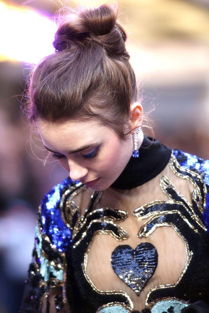 The Mortal Instruments: City of Bones actress completed her look with opulent Cartier diamond-and-sapphire earrings and swipes of glittery gold and electric-blue eyeliner on her lids.