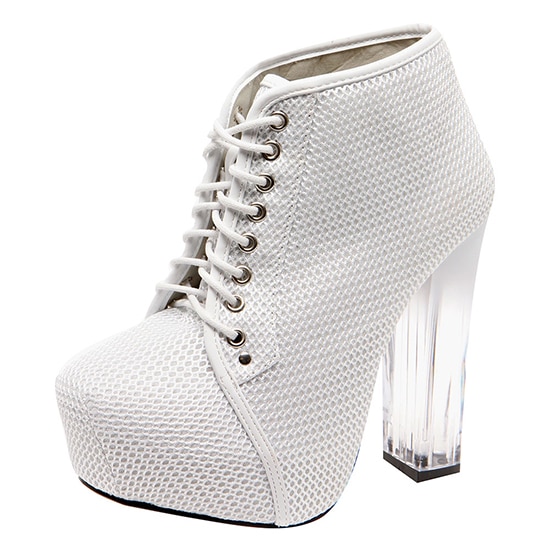 Her Boohoo boots feature an overall white mesh material with a lace-up design, and they’re done in a chunky silhouette, too. They have square toes with hidden platforms and interesting Perspex heels.