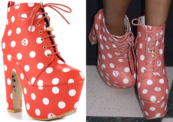 Chunky platform boots are popular, but the design of Leigh-Anne’s boots isn’t easy to match with other ensembles. It’s a good thing her style is loud, so the shoes somehow complemented her outfit. The boots come in dominant coral with white polka-dot and skull prints. A gold-tone charm is also available at the front although it’s somewhat covered by the lace-up fastening. These chunky boots are finished with about 5 3/4 inches of block heels and 2 1/4 inches of platforms.