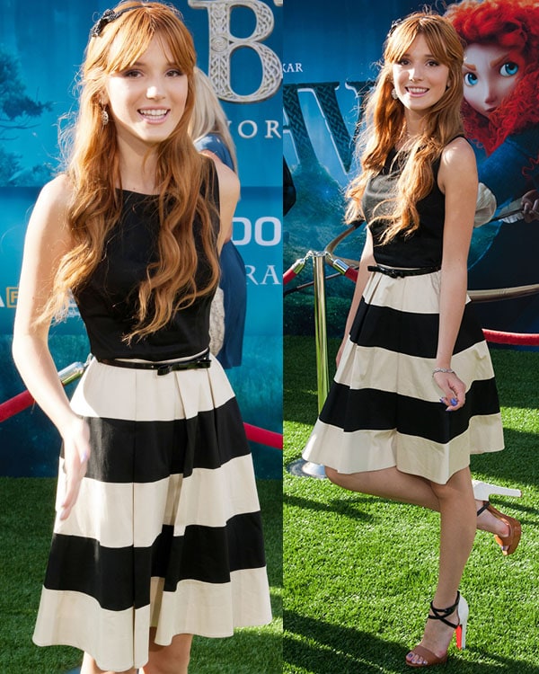 Bella Thorne looks effortlessly stylish in a black and cream striped dress paired with bold heels at the Brave movie premiere in Hollywood on June 18, 2012 (Credit: WENN)