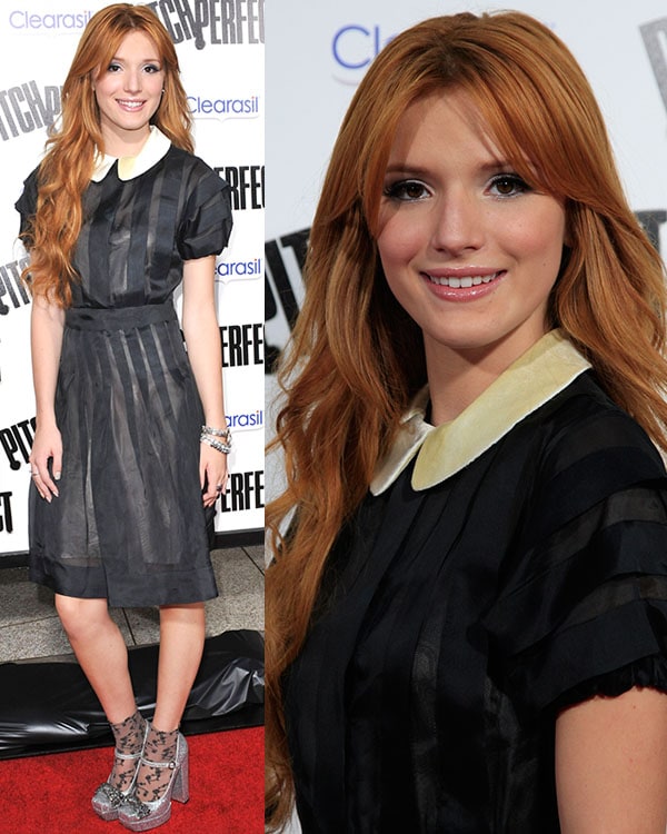 Bella Thorne channels a retro vibe in a sheer black dress with a contrasting collar, paired with glittery platform heels at the Pitch Perfect premiere in Los Angeles on September 24, 2012 (Credit: WENN)