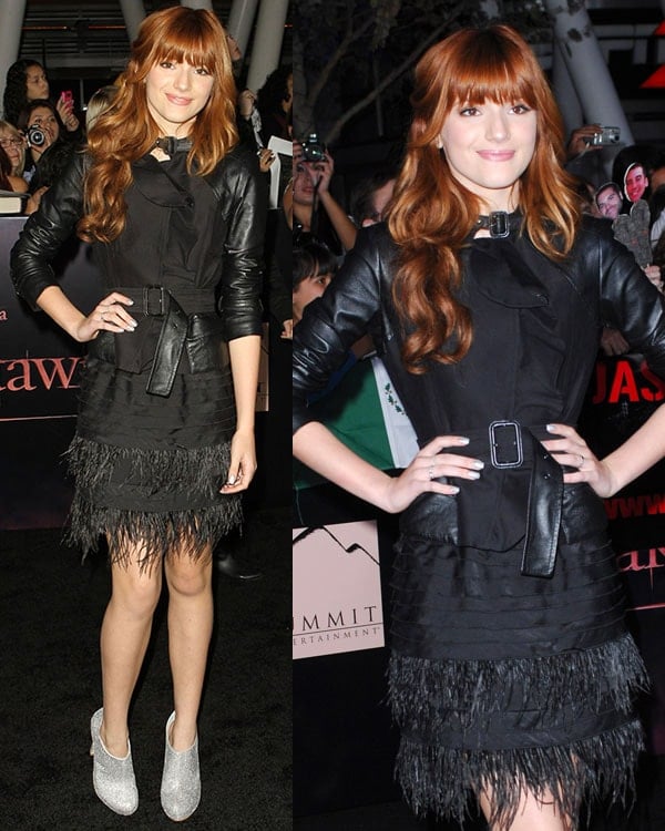 Bella Thorne exudes edgy elegance in a black feathered mini dress and silver glitter ankle boots at The Twilight Saga: Breaking Dawn – Part 1 premiere in Los Angeles on November 14, 2011 (Credit: WENN)