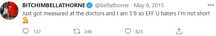 In this 2015 tweet, Bella Thorne shares that she was measured at the doctor’s office and confirms her height as 5’8″, addressing critics who previously called her short