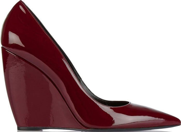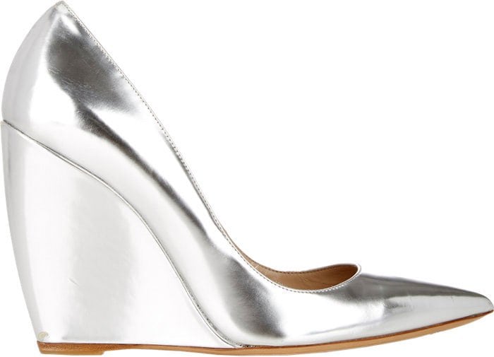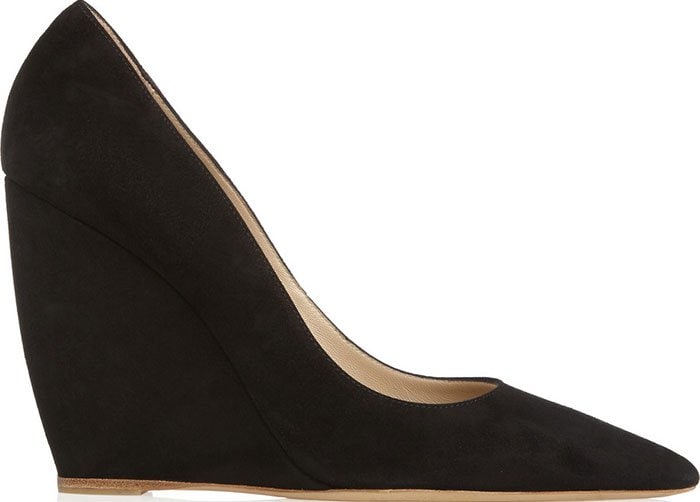 These pointed-toe wedges feature low-cut vamps and slightly curved self-covered heels about 3.5 inches high: