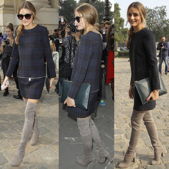 In September of 2013, we spotted Olivia Palermo in the same boots during Paris Fashion Week. She styled them with a structured plaid dress from Zara.