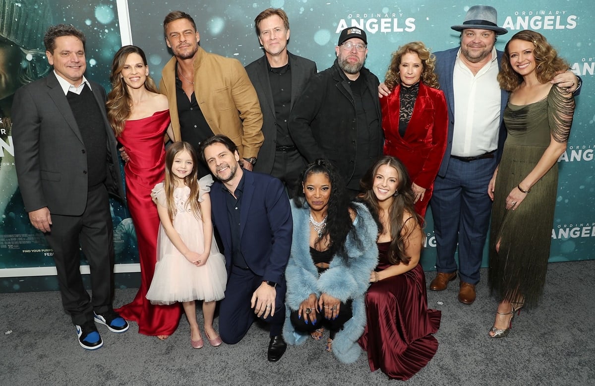 Kevin Downes, Hilary Swank, Alan Ritchson, Emily Mitchell, Jon Gunn, Jon Berg, Andrew Erwin, Tamala Jones, Nancy Travis, Courtney Johnson, Drew Powell, Amy Acker, Catherine Ritchson, and Greg Silverman attend Lionsgate’s “Ordinary Angels” New York Premiere at SVA Theater on February 19, 2024, in New York City (Credit: Marion Curtis / StarPix for Lionsgate / INSTARimages)