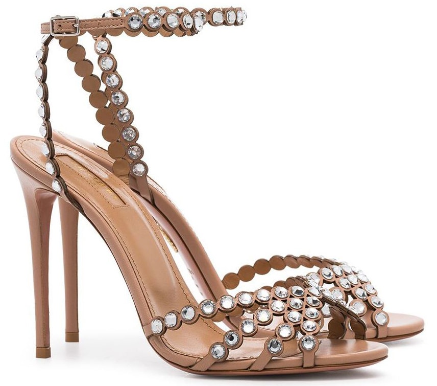 Nicky opted to forgo a necklace and finished her ensemble with Aquazzura’s popular “Tequila” evening sandals, available in metallic blue, pink, and silver at Mytheresa.