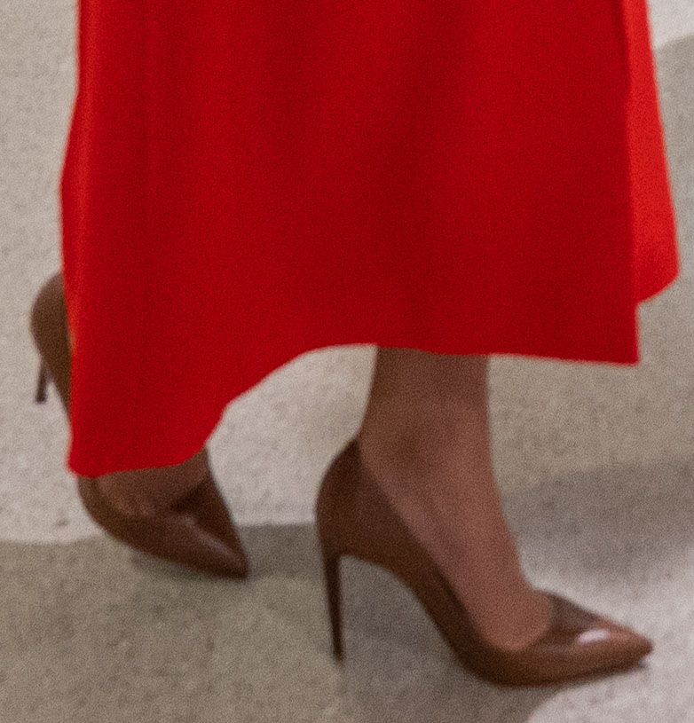 She then color-coordinated her bag with her pumps, opting for the brown “Celia” pumps from Ralph Lauren that you can buy at Farfetch.