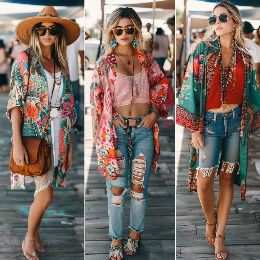 The flowing silhouette of the kimono contrasts beautifully with the fitted nature of the jeans, creating a balanced and visually appealing look. This outfit combination is perfect for those looking to make a statement while keeping their base layers simple and comfortable.