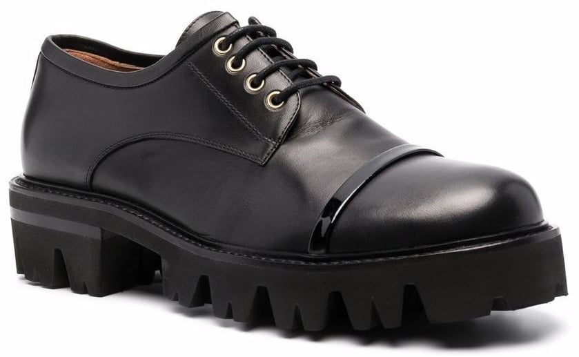 Known for its sleek silhouettes, precise fit, and bold yet elegant designs, Malone Souliers combines traditional Italian craftsmanship with innovative styling. These chunky lace-up shoes are handcrafted in Italy from smooth black leather, featuring round toes, a classic front lacing system, and ridged rubber soles for a modern edge.