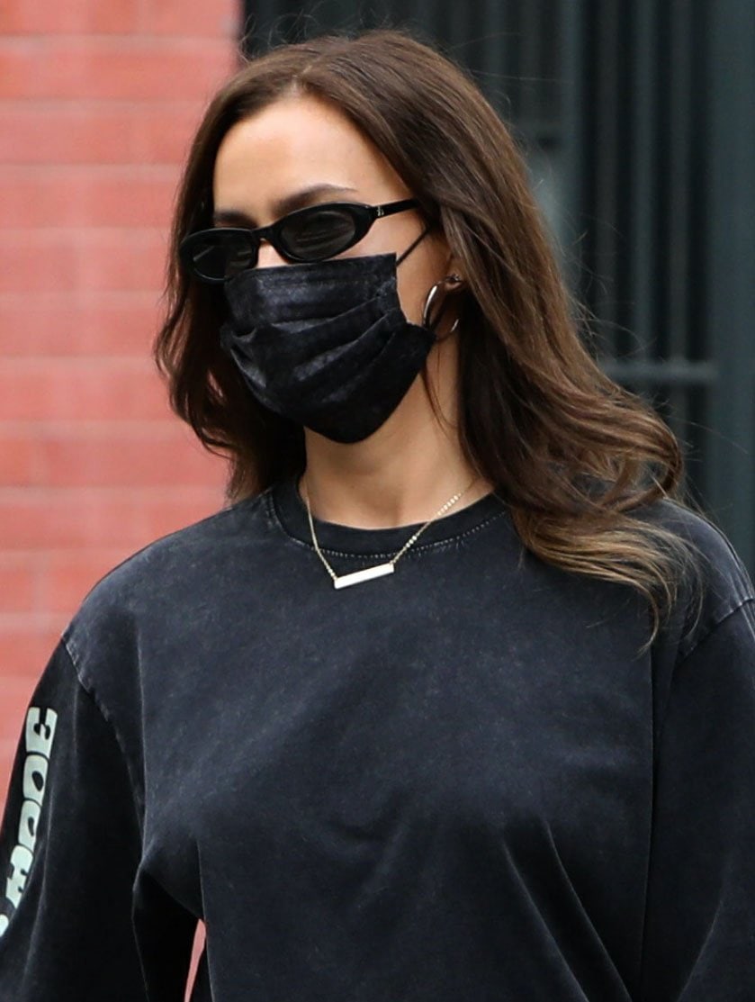 Allowing her tresses to fall freely around her shoulders, Irina kept a low profile with Roberi & Fraud Black Baby Betty sunglasses and a Barriere basketweave face mask.