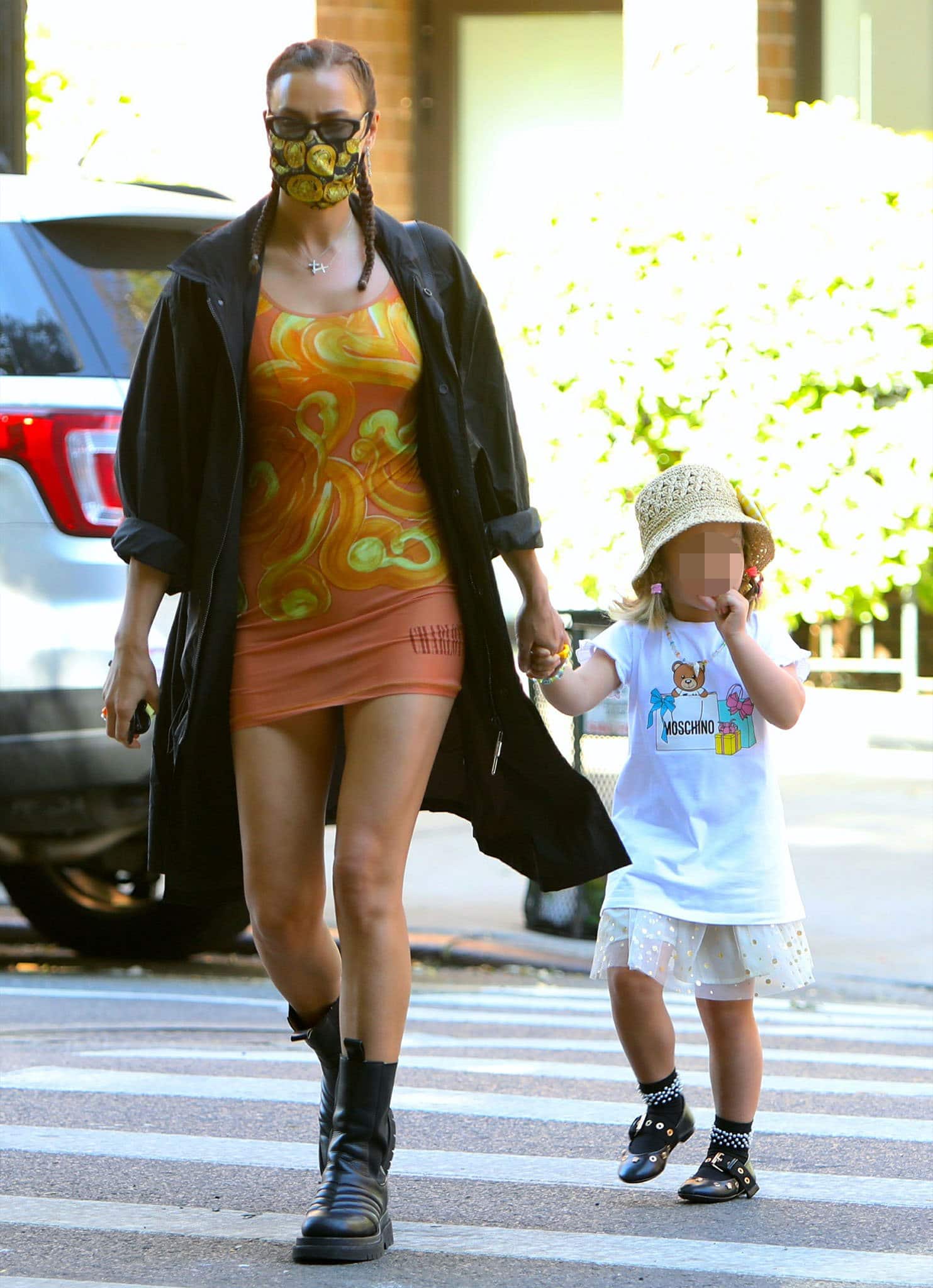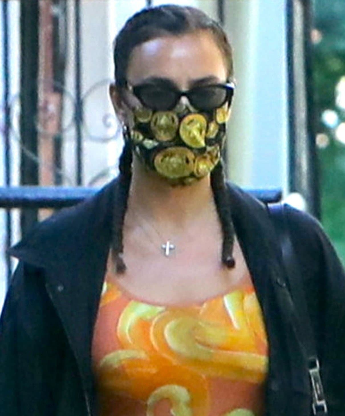 Proving she’s the ultimate cool mom, Irina styled her hair in cornrows with pigtail braids. She then hid her beauty underneath a $195 Versace Medusa-print face mask and a pair of Poppy Lissiman Courtney sunglasses.