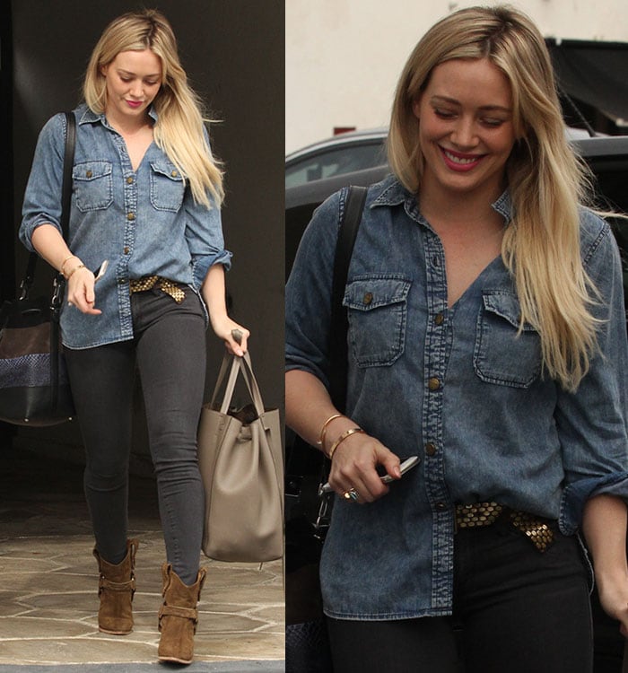Hilary Duff wears black jeans with a denim button-down long-sleeved shirt by Current/Elliot