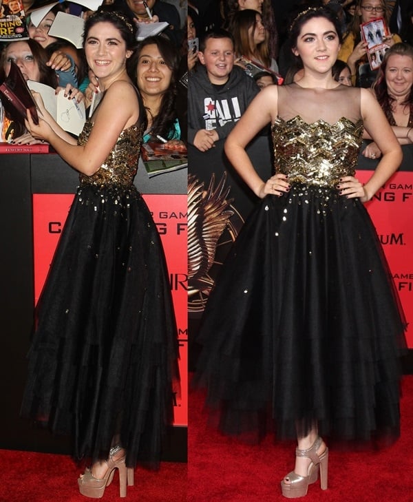 While Elizabeth Banks selected a Versace dress and Jennifer Lawrence a Christian Dior gown, Isabelle Fuhrman donned a Christian Siriano Fall 2013 sleeveless frock for the Los Angeles premiere of “Catching Fire.”
