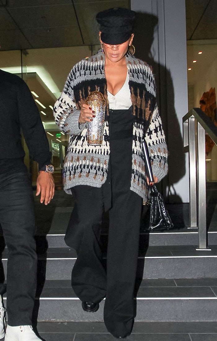 J.Lo layered the look with a cozy, multicolored sweater to conceal her famous curves, perfectly matching her glittery TaylorMadeBling gold drip Dsw cup.