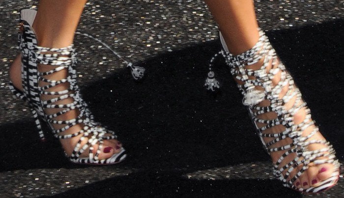 The monochrome outfit was completed with a pair of black-and-white Sophia Webster “Lacey” gladiator sandals.
