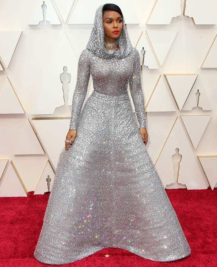 Before taking the stage for a special performance with Billy Porter at the 2020 Academy Awards, Janelle Monáe sparkled on the red carpet in a custom Ralph Lauren silver A-line dress with a hand-embroidered draped hood that reportedly took 600 hours to make.