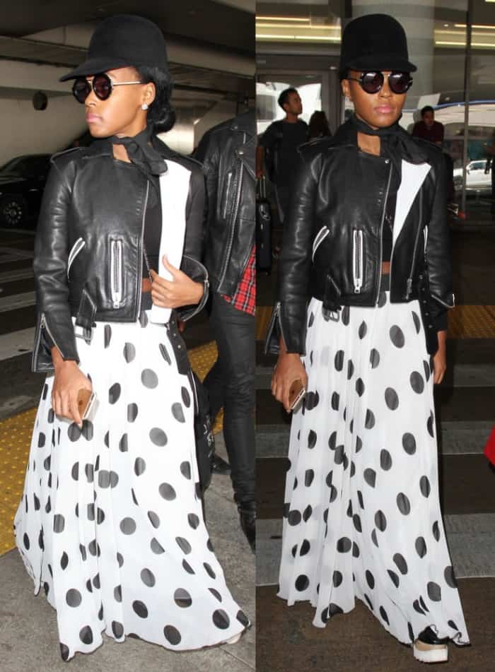 Janelle wore her standard black and white scheme, standing out from the crowd in a bold polka-dotted maxi skirt.
