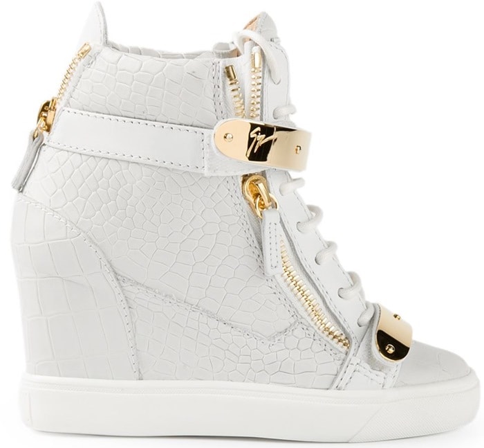 Would you dress like Jennifer Lopez for a day out with your kids? Her white leather wedge hi-top sneakers from Giuseppe Zanotti feature round toes, lace-up front fastening, logo patches at the tongues, side zip fastenings, pull tabs at the rear, gold-tone logo plaques, concealed wedge heels, rubber soles, and pebbled leather texture. You can get them at Amazon: