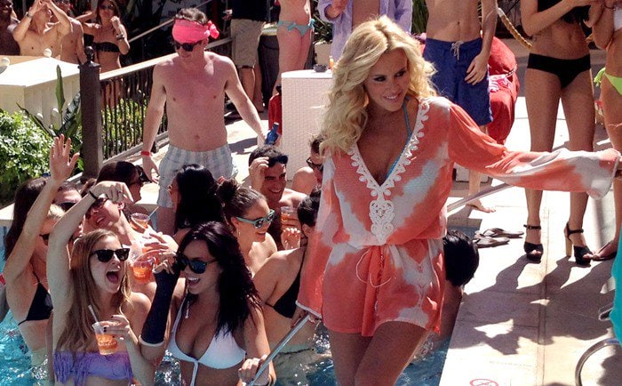 She wore her hair down in simple waves, which worked great for a day of poolside activities. We’re not sure whether Jenny always wears Louboutin heels poolside, but she looked great.