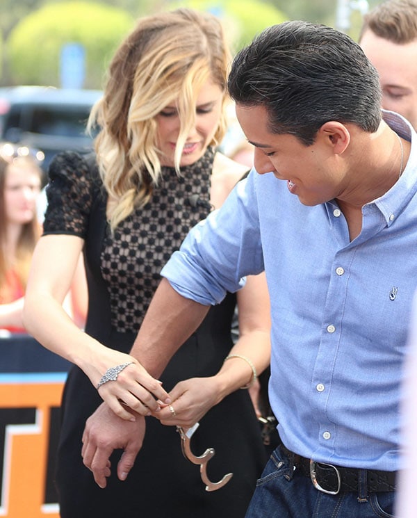 They all shared some laughs as ‘The Hitcher’ actress fastened the cuffs around the entertainment TV program host’s wrists.