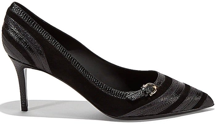 She finished her attire with black Salvatore Ferragamo striped suede and calfskin pumps featuring cute Gancio buckles.