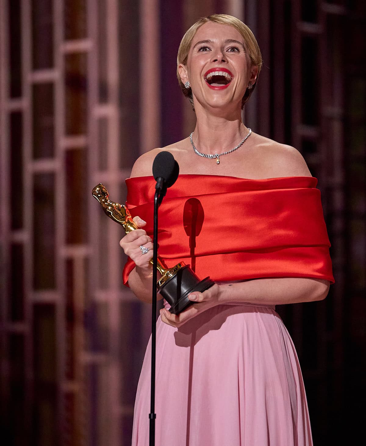 Jessie Buckley beams while accepting the Best Actress award at the 98th Academy Awards on March 15, 2026, at the Dolby Theatre in Hollywood, becoming the first Irish woman to win the category while wearing a striking red-and-pink Chanel gownJessie Buckley beams while accepting the Best Actress award at the 98th Academy Awards on March 15, 2026, at the Dolby Theatre in Hollywood, becoming the first Irish woman to win the category while wearing a striking red-and-pink Chanel gown (Credit: Trae Patton / The Academy)
