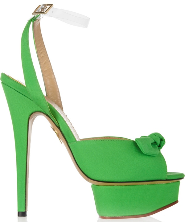 Do you love the pop of green shade in the singer’s rock star getup? Her sandals are fashioned from crepe de chine and feature classic bows at the vamps, transparent PVC buckle-fastening ankle straps, peep toes, sky-high heels that measure about 6 inches, and Charlotte Olympia’s signature island platforms that measure 1.5 inches.