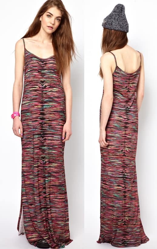The singer’s maxi dress is made of soft-touch jersey fabric, making it a great daytime choice for summer. It has a busy print, so be mindful of the accessories you pair with it.