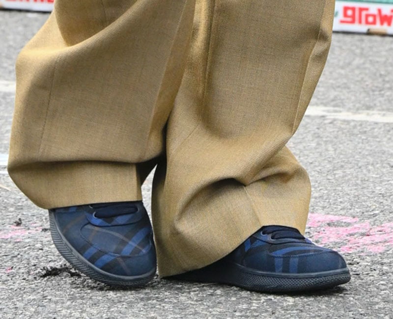 - Footwear: She completed her look with Burberry’s Arthur chunky sneakers and matching checkered socks.