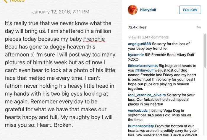 Hilary Duff was seen in January 2016 putting on a brave face while arriving at AOL Build in New York City following the passing of her French bulldog, Beau.