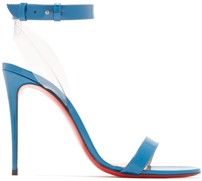 These blue leather sandals are crafted with clear PVC panels to create the striking impression of floating ankle straps.