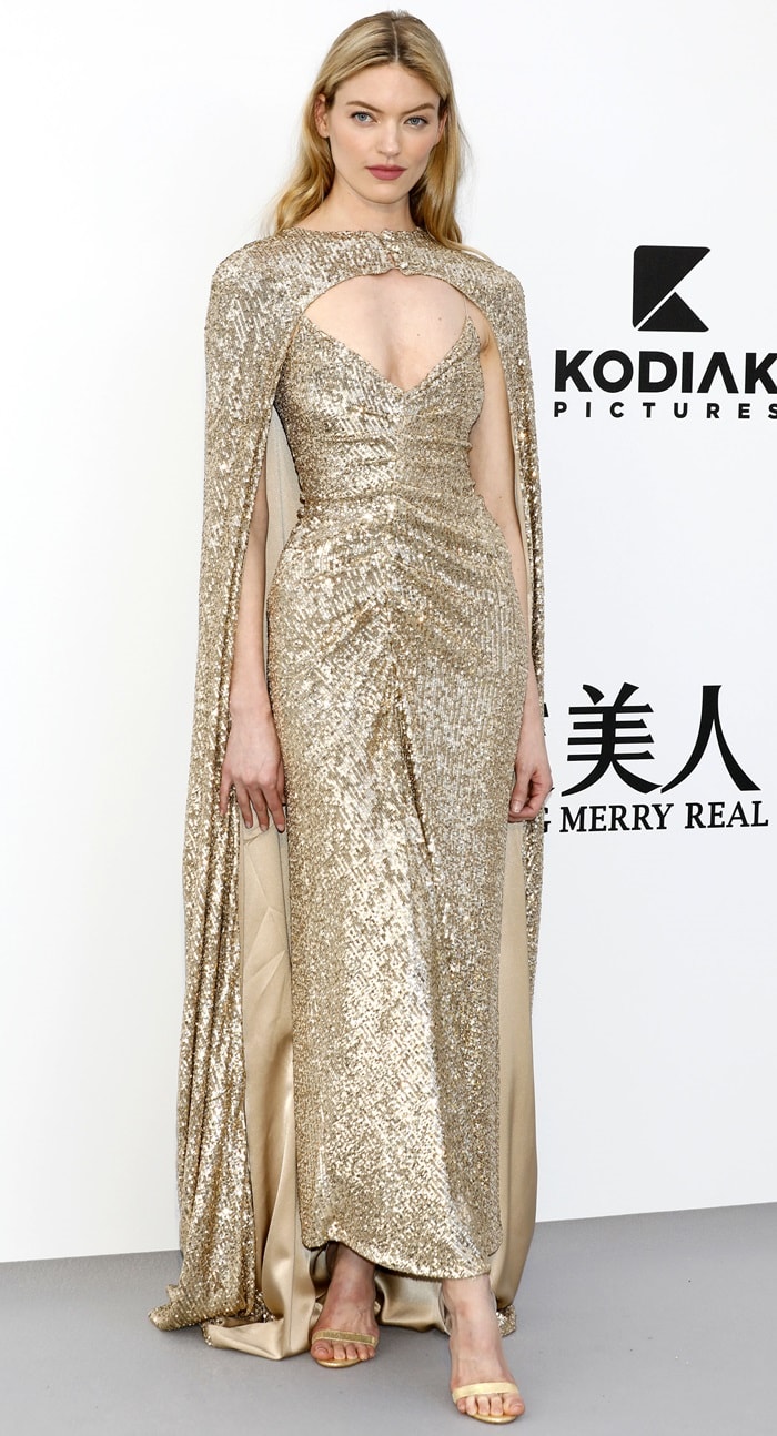 The American fashion model did not disappoint at the amfAR Gala during the 2019 Cannes Film Festival in a sparkly gold Monique Lhuillier Fall 2019 ankle-length dress styled with a cape.
