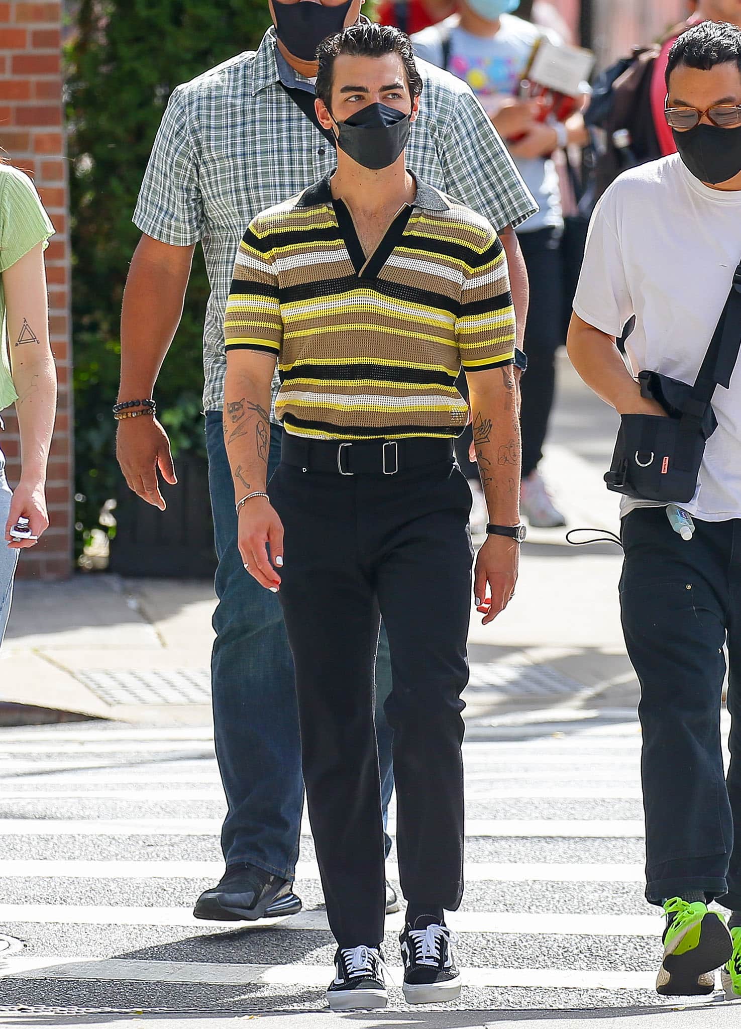 Meanwhile, her pop singer husband looked handsome in a throwback waffle knit top with black, yellow, and white stripes. He tucked it into belted black slacks and finished them with black Vans Old Skool sneakers.