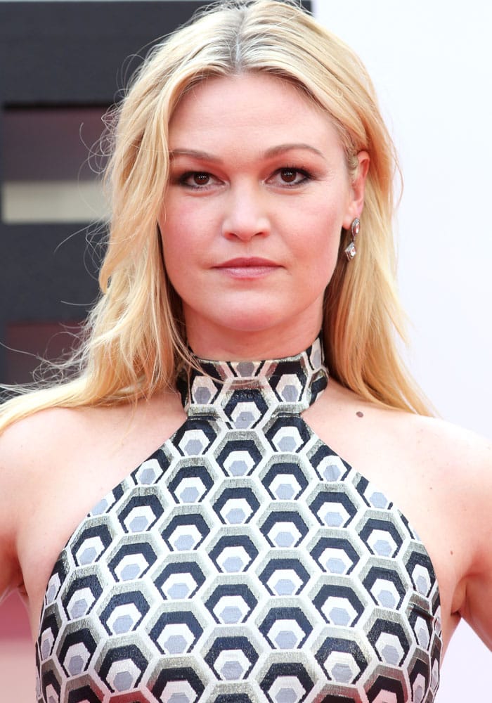 Julia wore a figure-hugging halter dress by New York designer Rubin Singer. The actress styled her dress with jewelry from Amrapali and a pair of “Welch” sandals in black suede and silver leather from Jerome C. Rousseau.