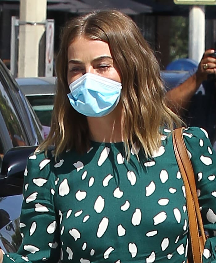Showing off her styling prowess, Julianne wore a green midi dress with white prints from the sustainable clothing brand, Reformation.