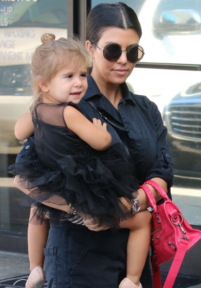 Kourtney slung a black, structured shoulder bag across her body as she proceeded to carry the adorable Penelope into the dance studio.