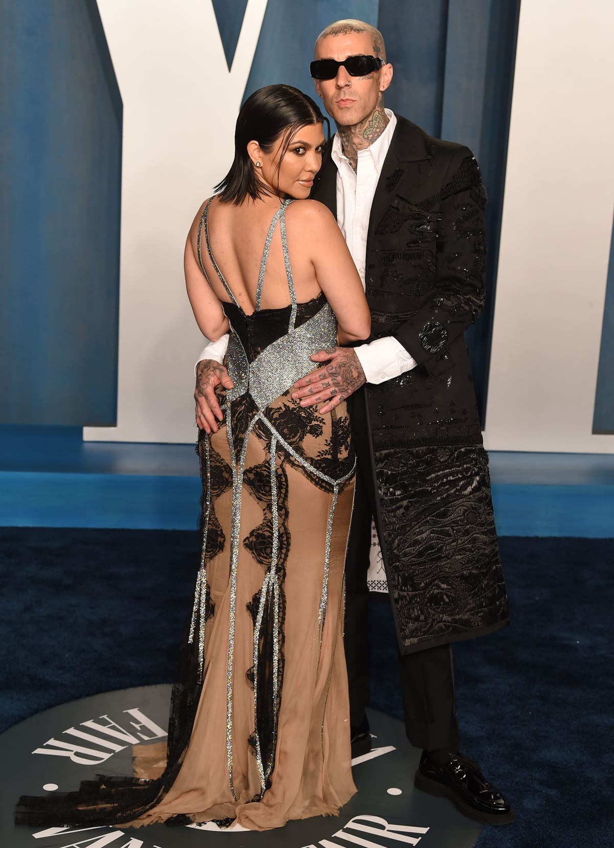 Kourtney Kardashian in a vintage Dolce & Gabbana dress and Travis Barker in a Thom Browne ensemble at the 2022 Vanity Fair Oscar Party held at the Wallis Annenberg Center for the Performing Arts in Beverly Hills, California, on March 27, 2022 (Credit: INSTARimages)