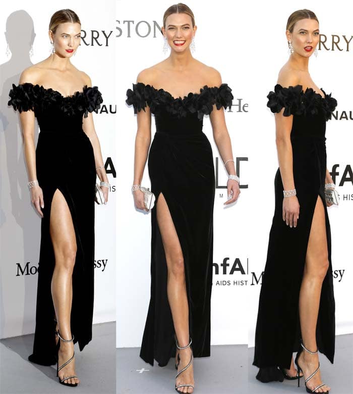 At the 23rd annual AmfAR gala, the former Victoria’s Secret Angel flaunted her trim body and long legs in a gorgeous black off-the-shoulder Marchesa gown.