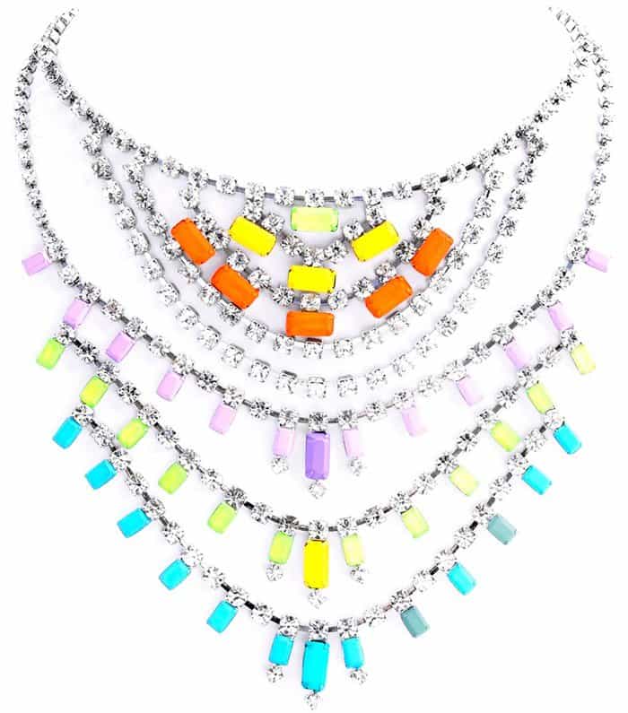 The “Dot Dash” tiered necklace is a gorgeous piece of work, don’t you agree? The multicolored crystal-and-rhodium necklace is perfect for an all-white, all-black, or monochromatic look, with its different colors standing out and making a chic statement.