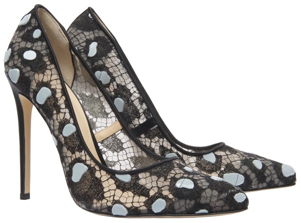 These shoes are crafted from black lace material and decorated with light blue leather appliques to achieve the spotted effect. They are also quite steep, with heels running 4.75 inches tall.