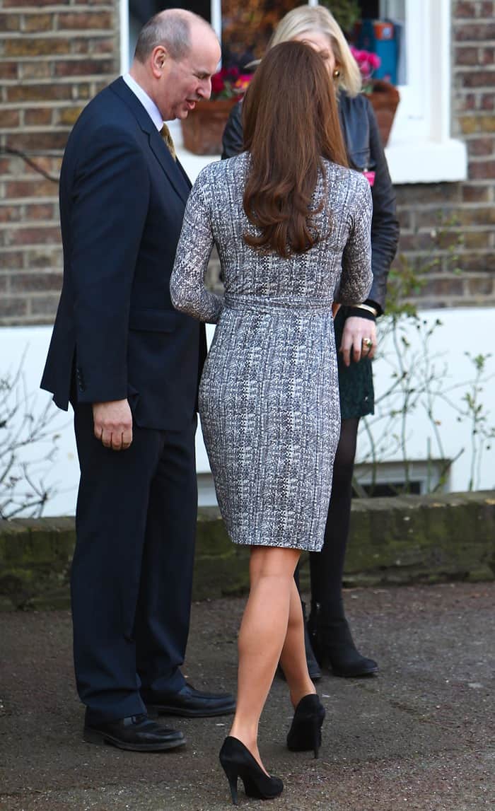 For her return to public engagements in 2013, Kate Middleton chose a past-season dress from the MaxMara Studio collection for her visit to Hope House, a treatment center in South London, on February 19, 2013 (Credit: WENN)
