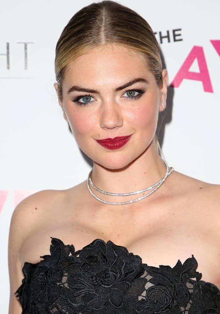 Kate Upton radiates elegance with a sleek center-parted low bun, bold brows, smoky eye makeup, and deep red lips, complementing her sparkling layered diamond choker and strapless black lace J. Mendel gown