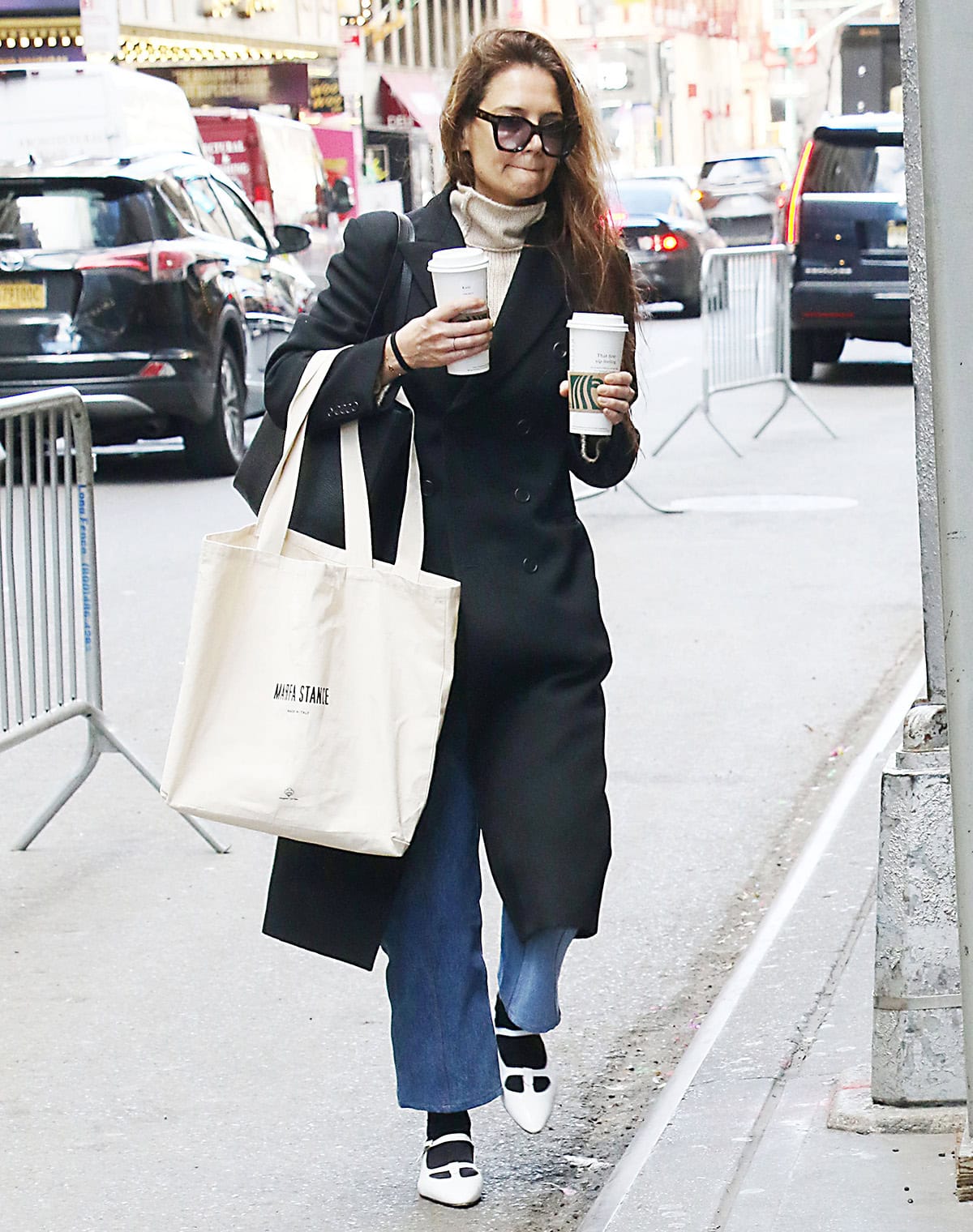 Katie bundled up in a black wool coat and a beige turtleneck sweater for her top to keep herself warm. She carried two big bags: her favorite Mansur Gavriel Everyday Soft tote bag over her shoulder and a Marfa Stance canvas tote bag over her arm.