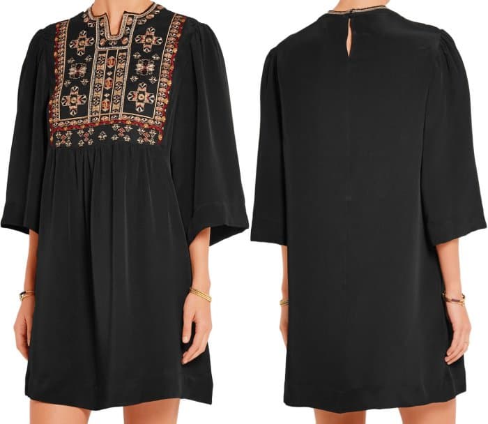 The 38-year-old actress and filmmaker wore the “Ren” shift dress from Isabel Marant, which features black silk crepe de Chine and folk-inspired embroidery created with red, saffron, and gold yarn.