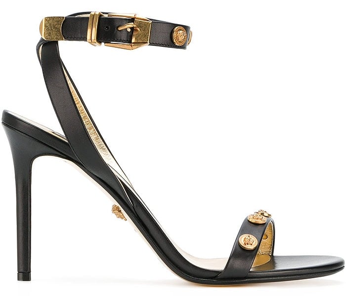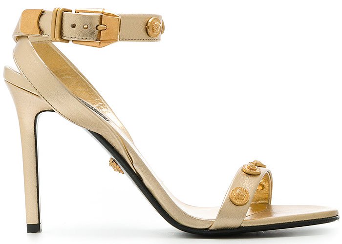 The Versace Medusa-medallion-studded leather ankle-strap sandals come from the special Versace Tribute collection. They also come with lower heels in beige, white, and black leather.