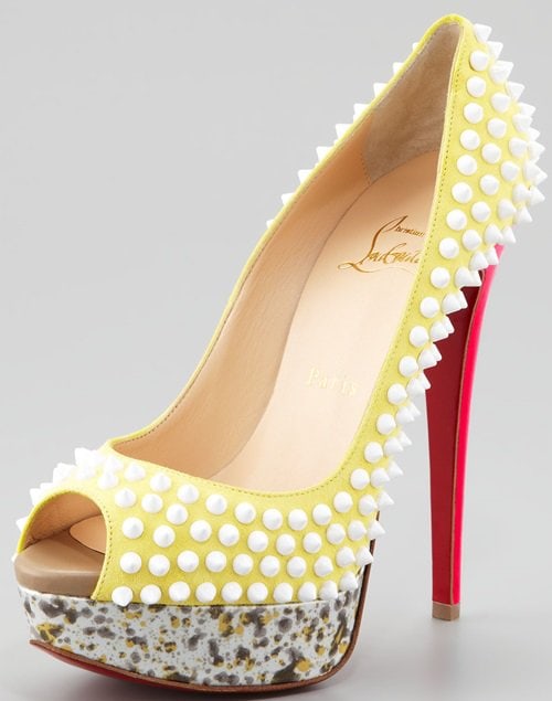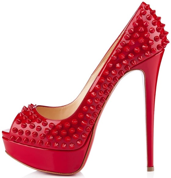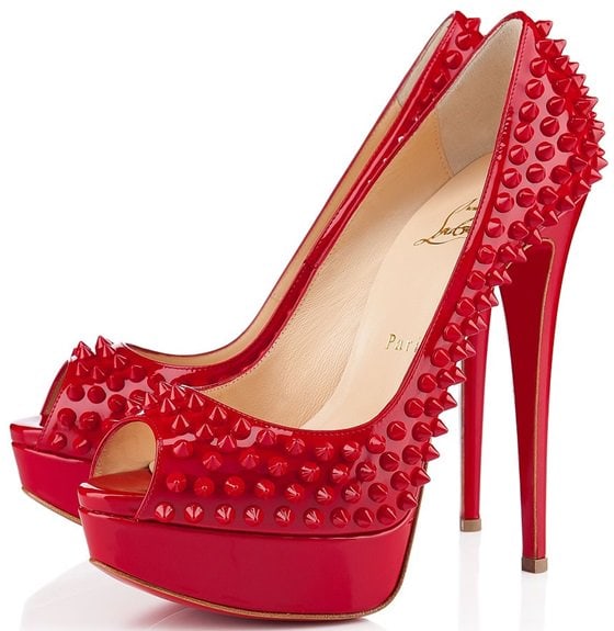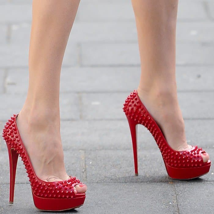 Her pumps are the ‘Lady Peep Spikes’ in red, which unfortunately seems to have sold out online.