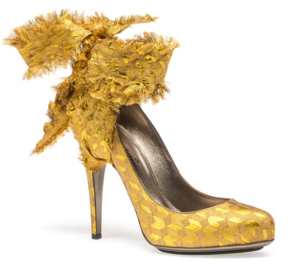Making the Lanvin Spring 2014 pumps hard to miss is the striking golden yellow brocade fabric. They also feature frayed ankle ties that add to the pair’s eye-catching design. Completing these pumps are covered heels that measure about 4.5 inches.