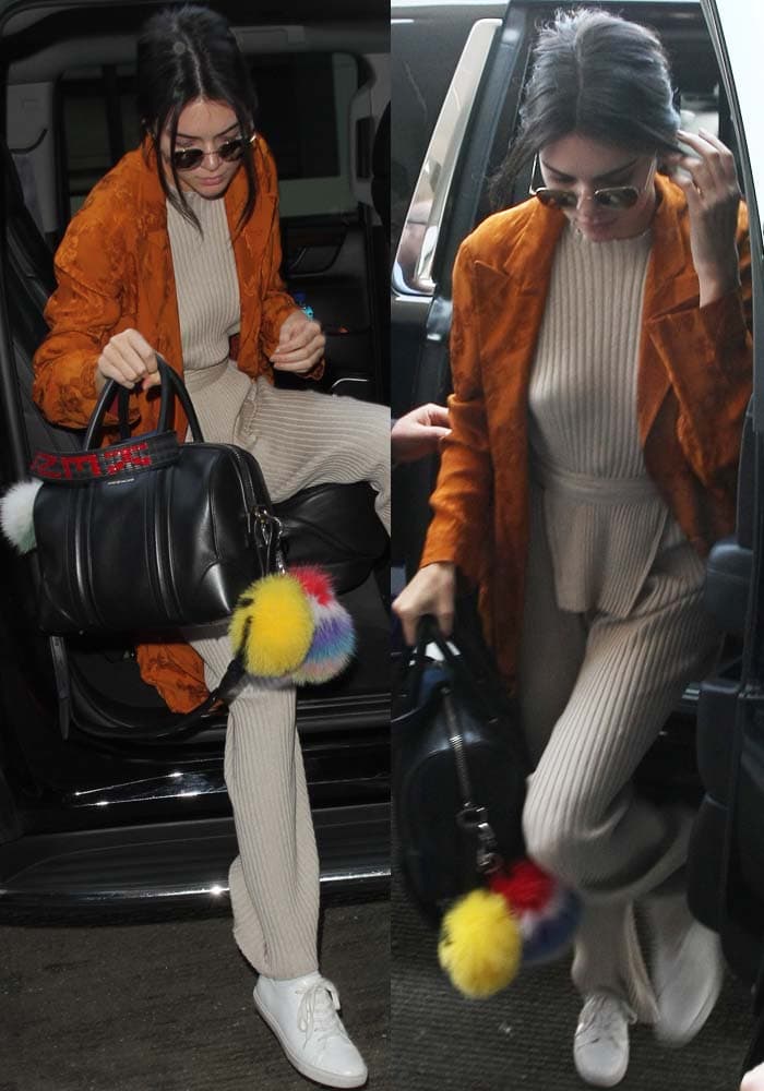 The model styled her look with a black Givenchy “Lucrezia” tote, some Fendi smiley pom-pom keychains, a pair of sunglasses, and her favorite Kenneth Cole “Kam” sneakers in white.